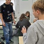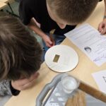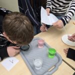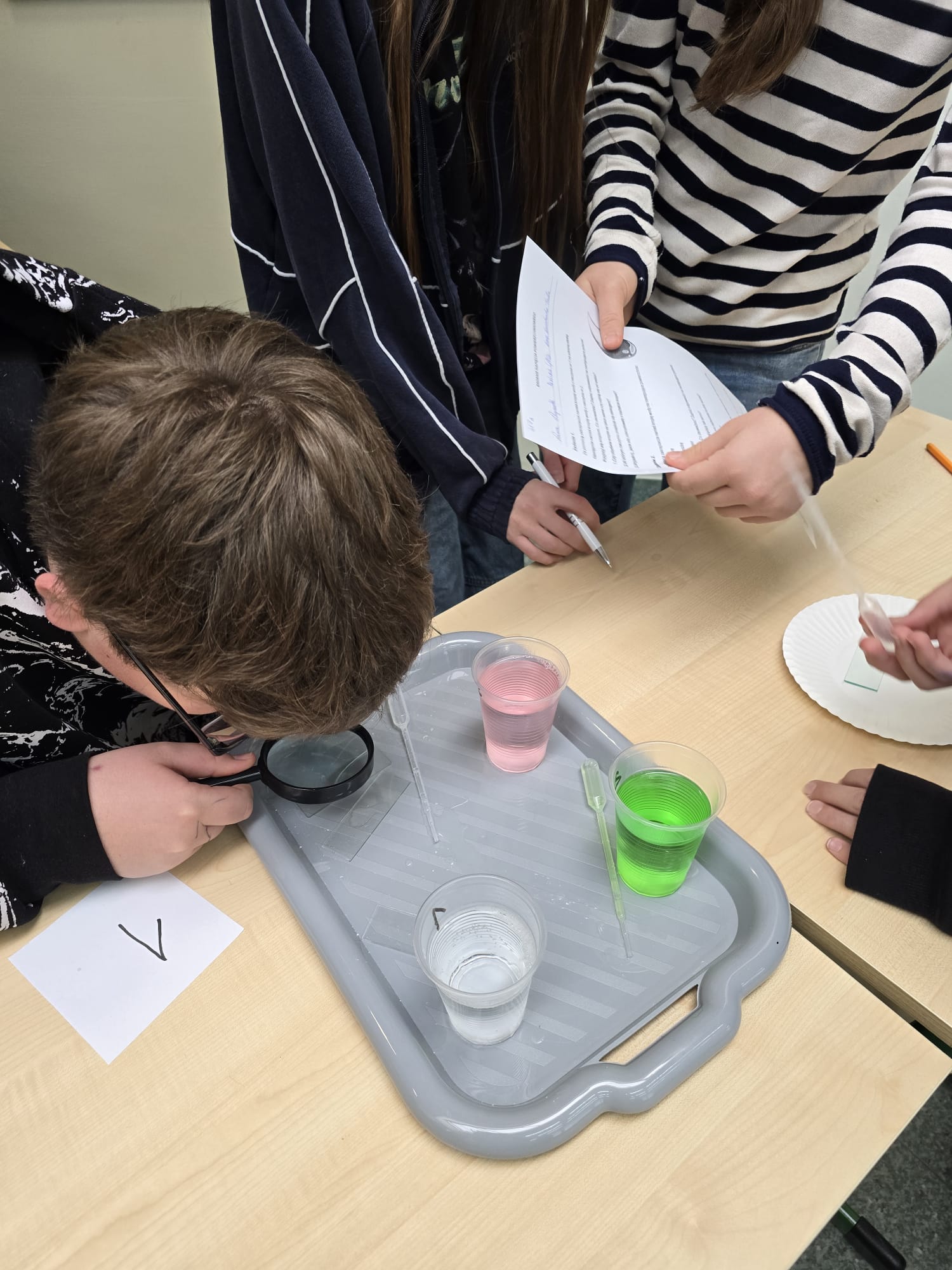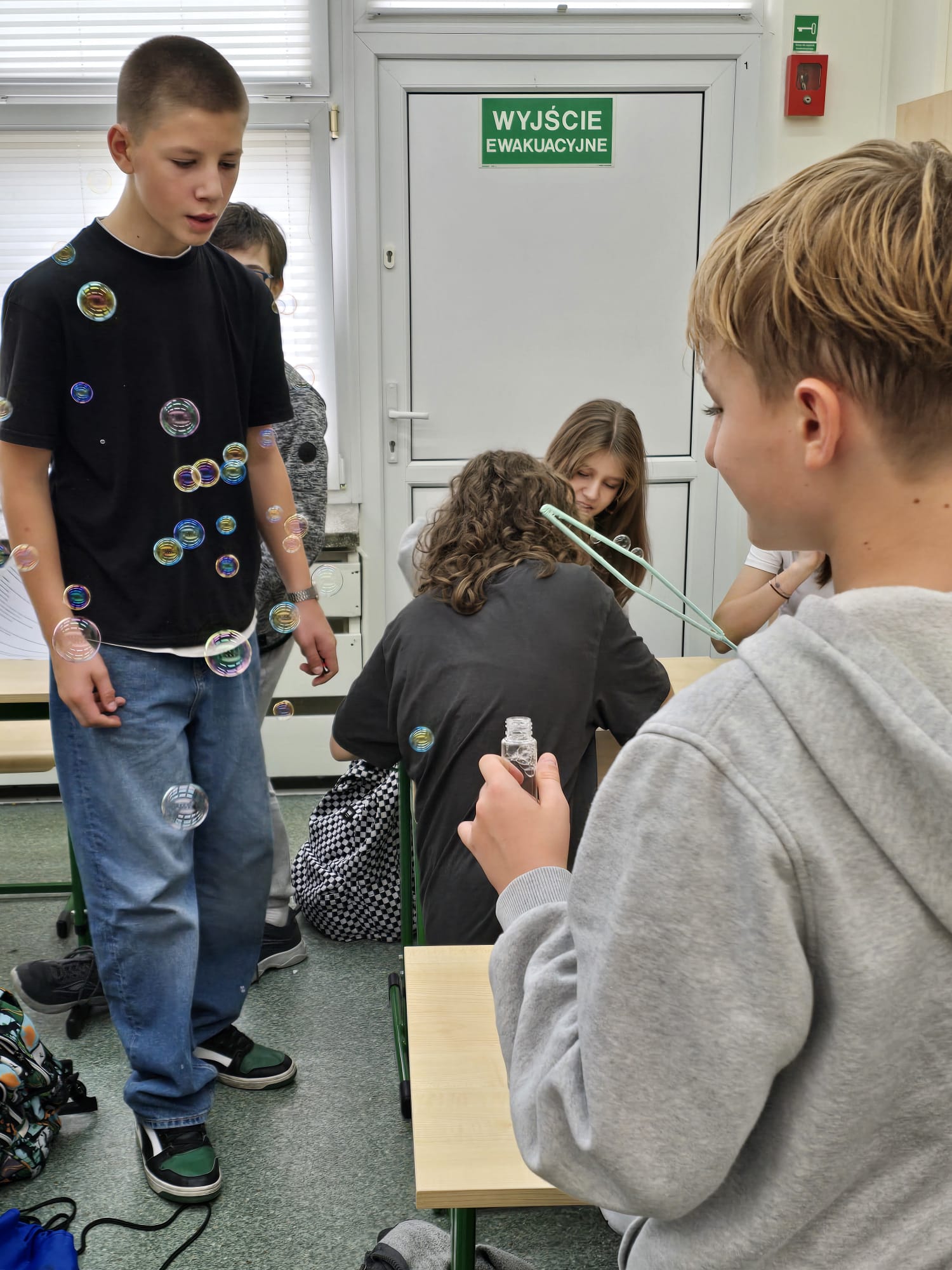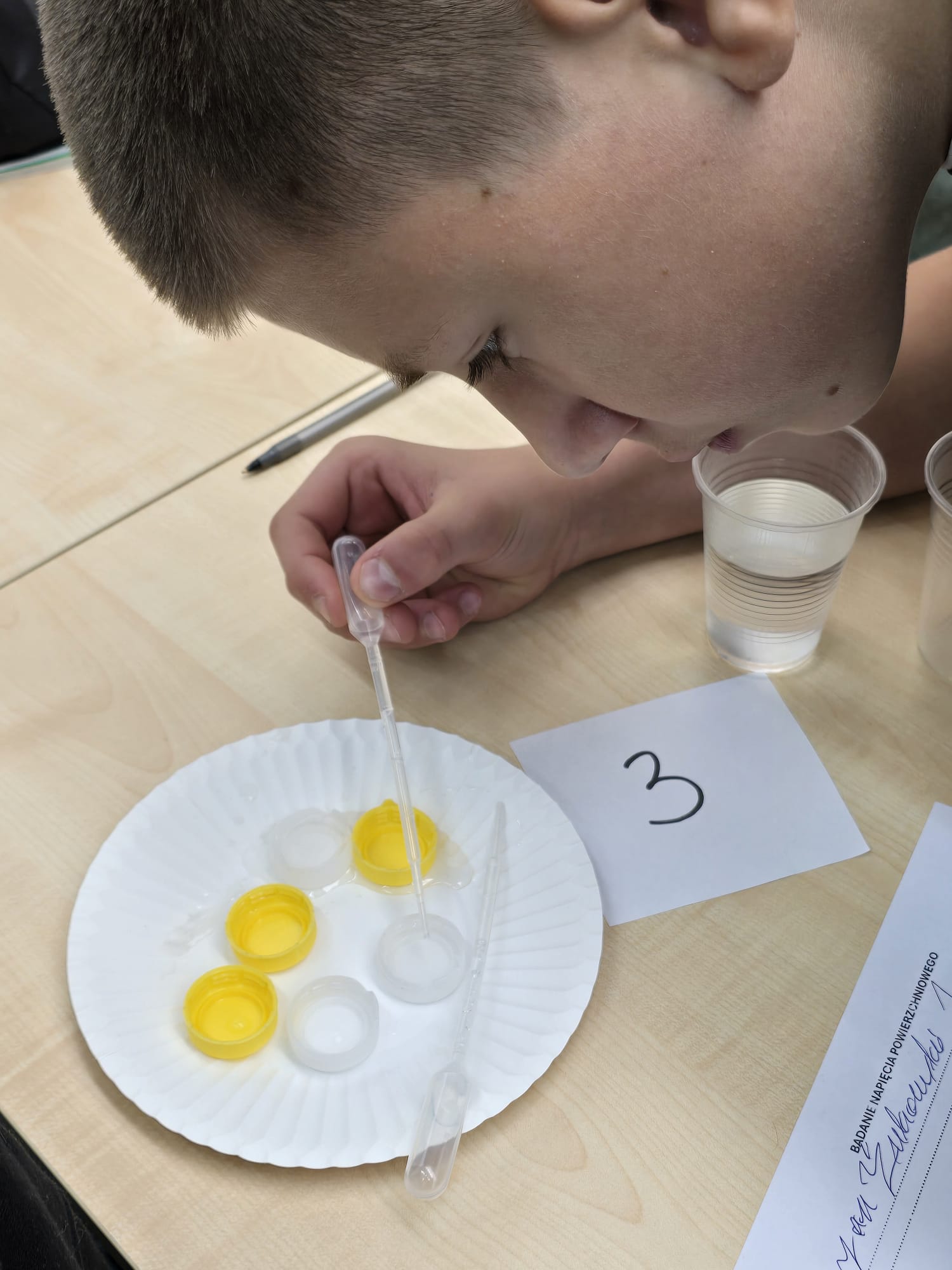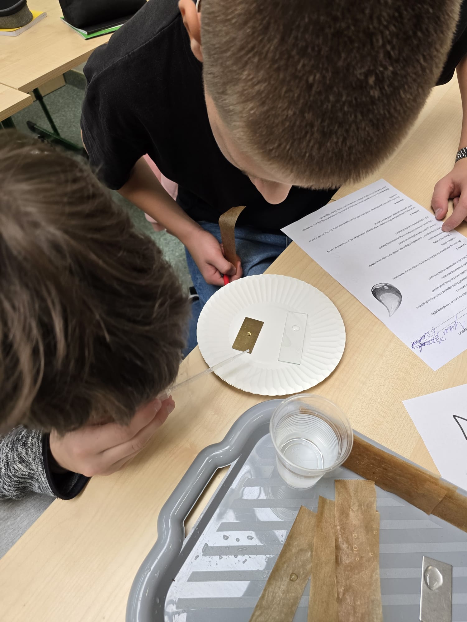 Klasa 7a podczas lekcji fizyki bada napięcie powierzchniowe różnych cieczy. Uczniowie posługując się pojęciami sił spójności i przylegania, zapisują wnioski z obserwacji.