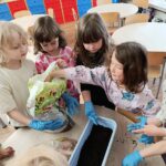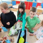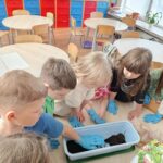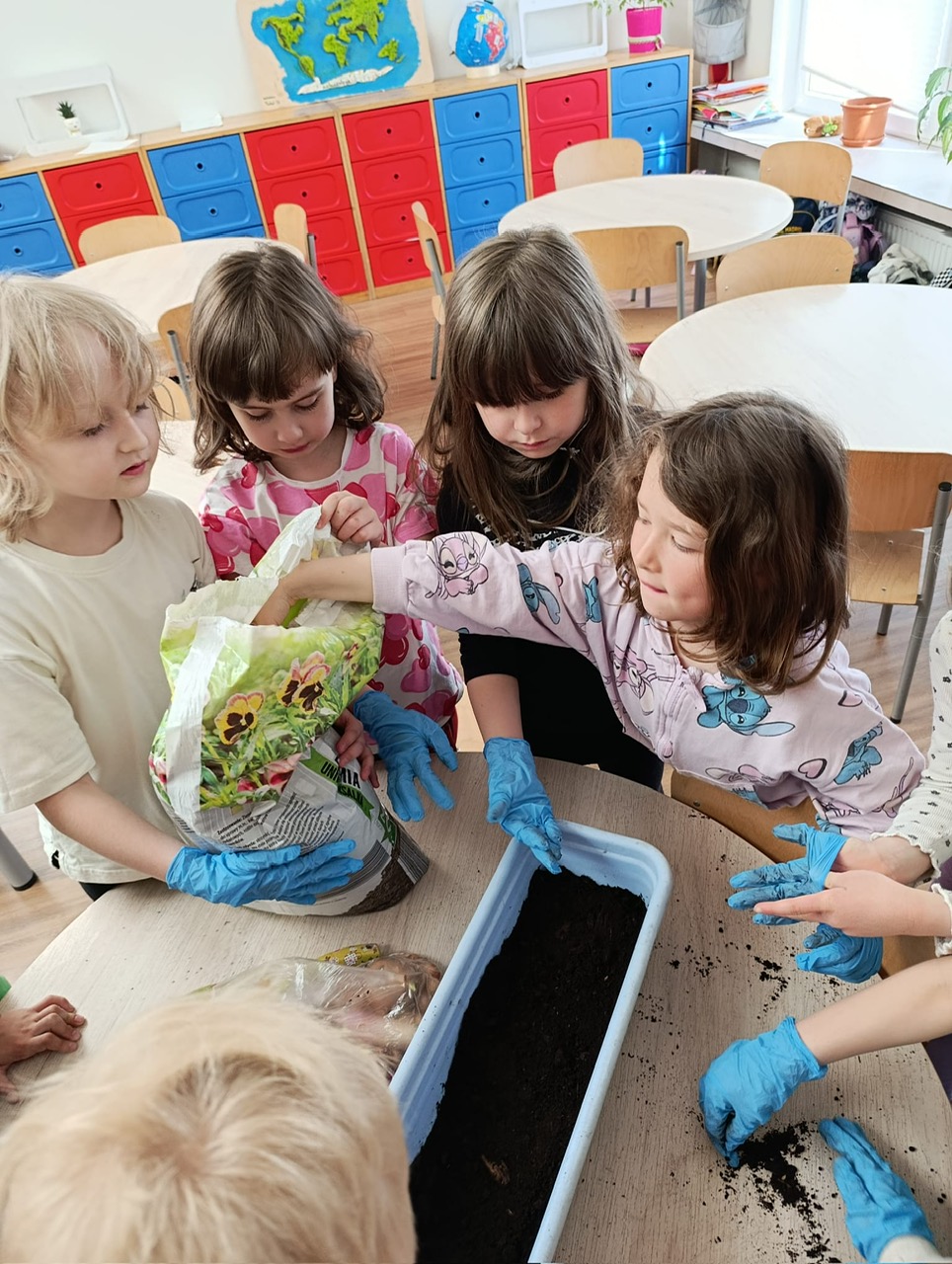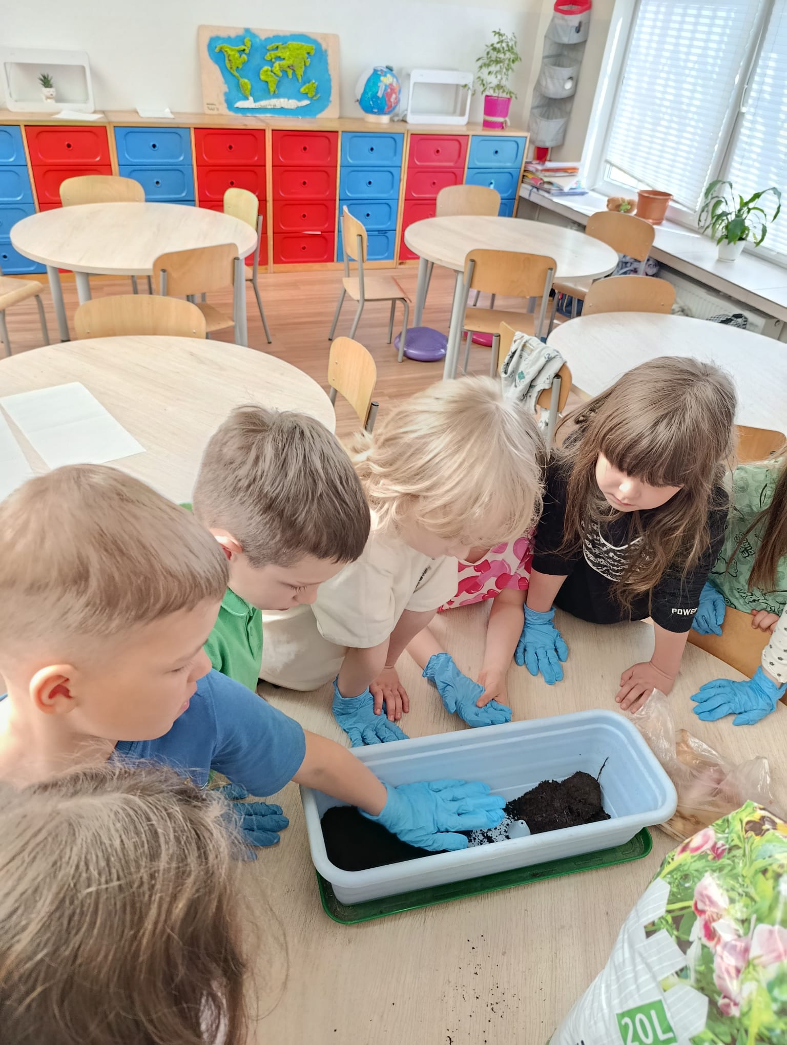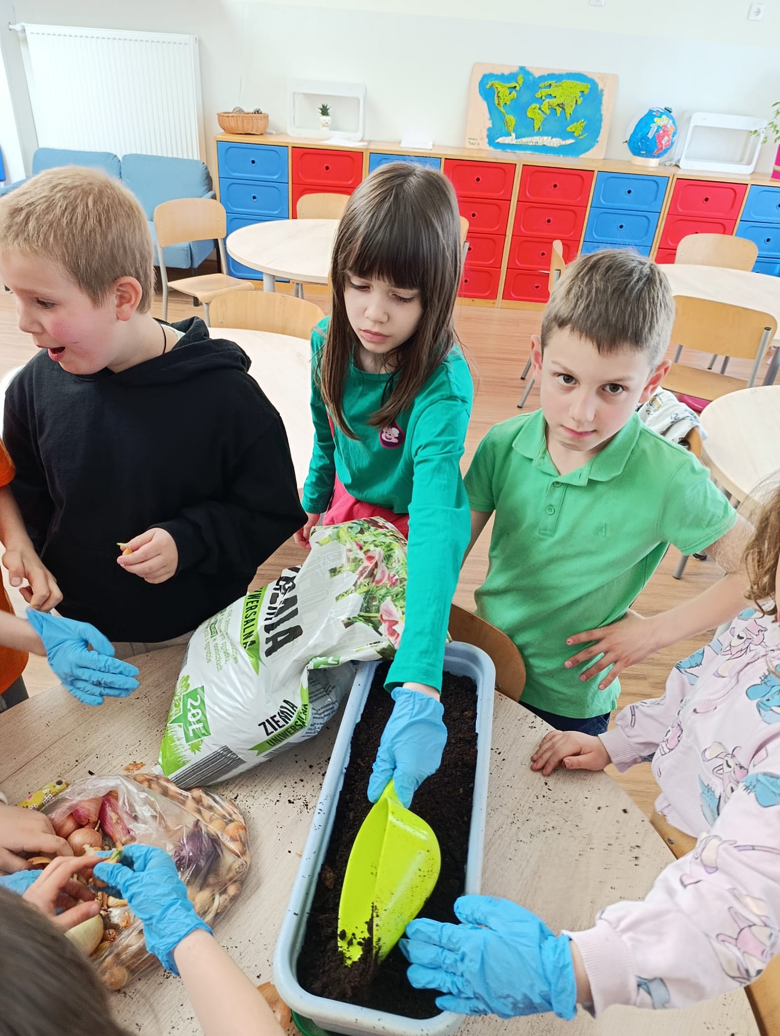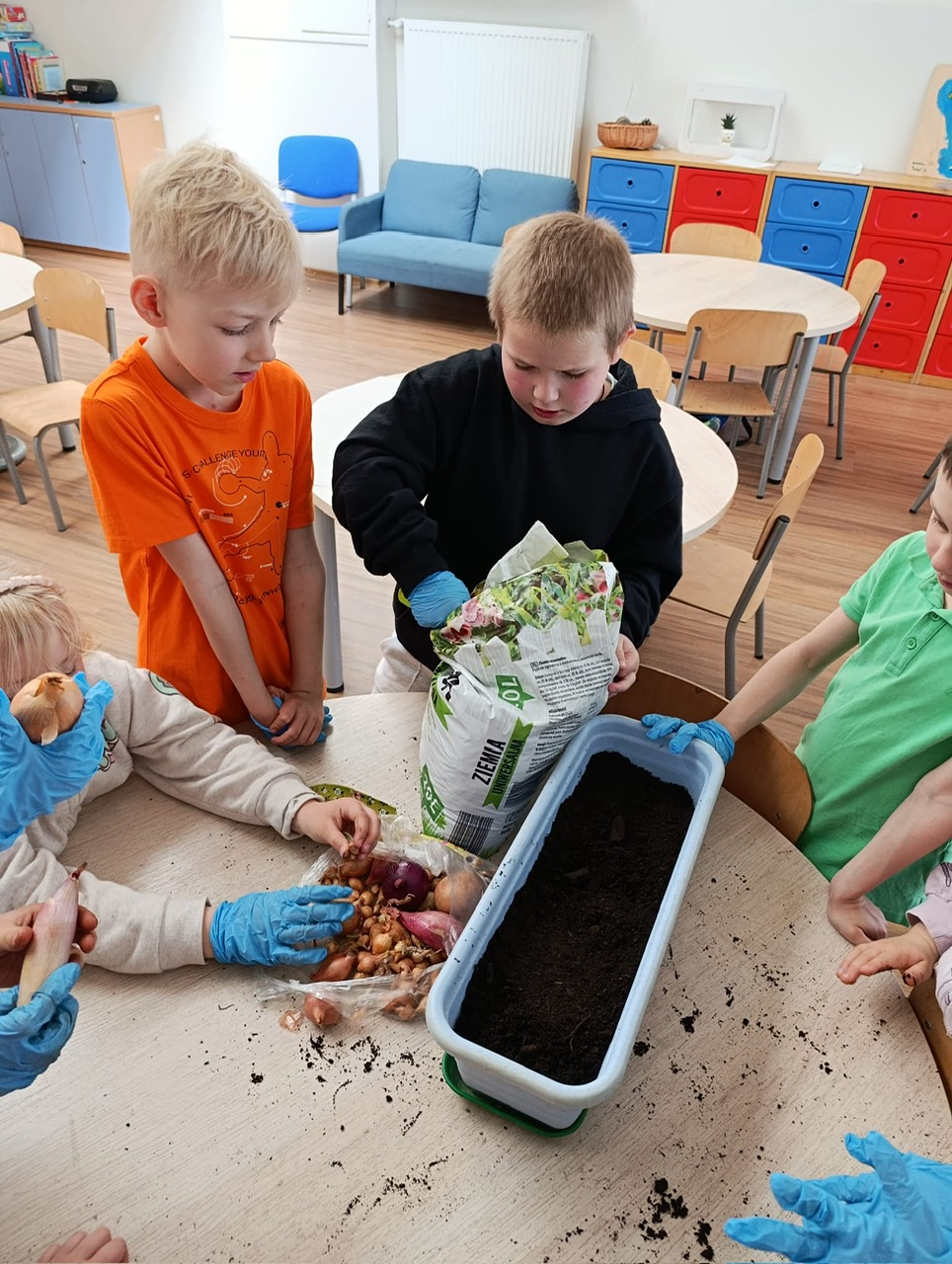Uczniowie z klasy 1b w zeszłym tygodniu zasadzili w dużych donicach szczypiorek.