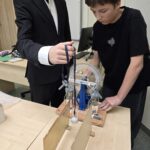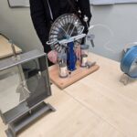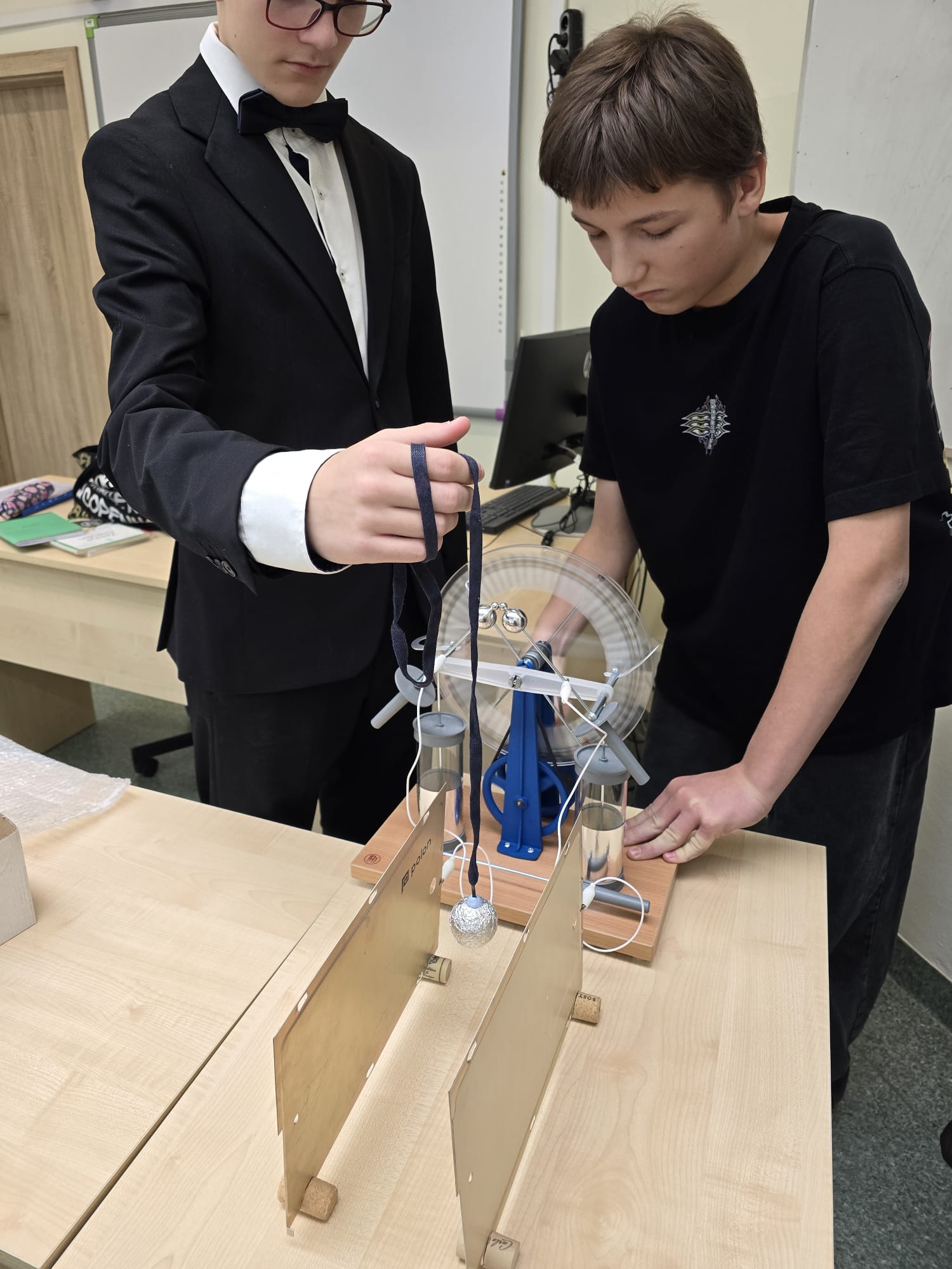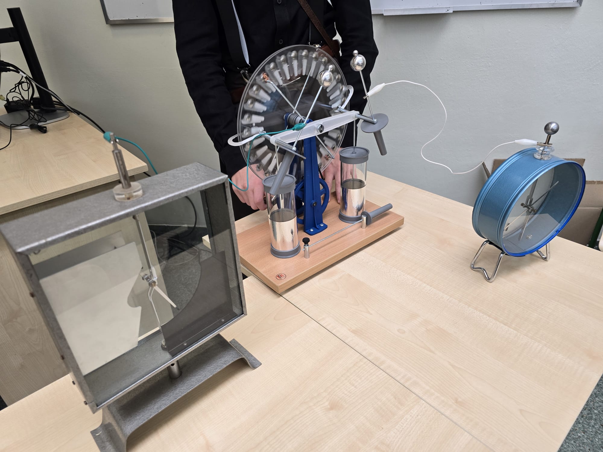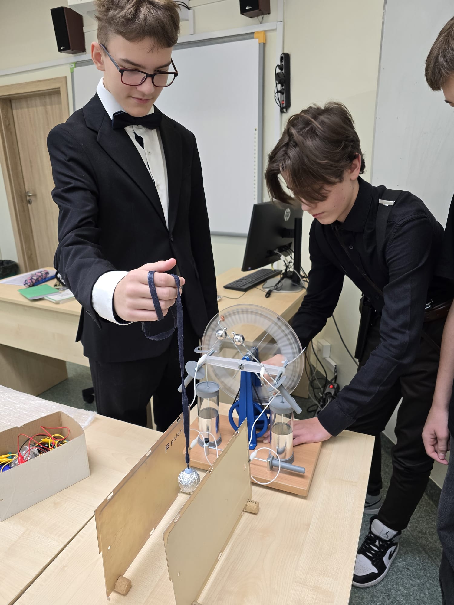 Klasa 8a podczas lekcji fizyki wytwarza wyładowania elektrostatyczne za pomocą maszyny elektrostatycznej.